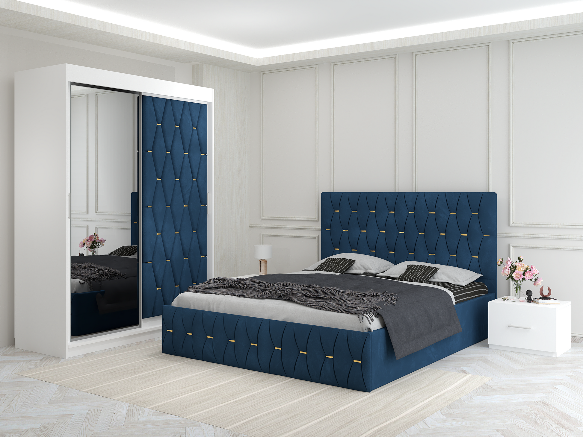 Dormitor Ana Albastru cu Dressing Tapițat și 2 Noptiere – Eleganță și Funcționalitate în Același Set