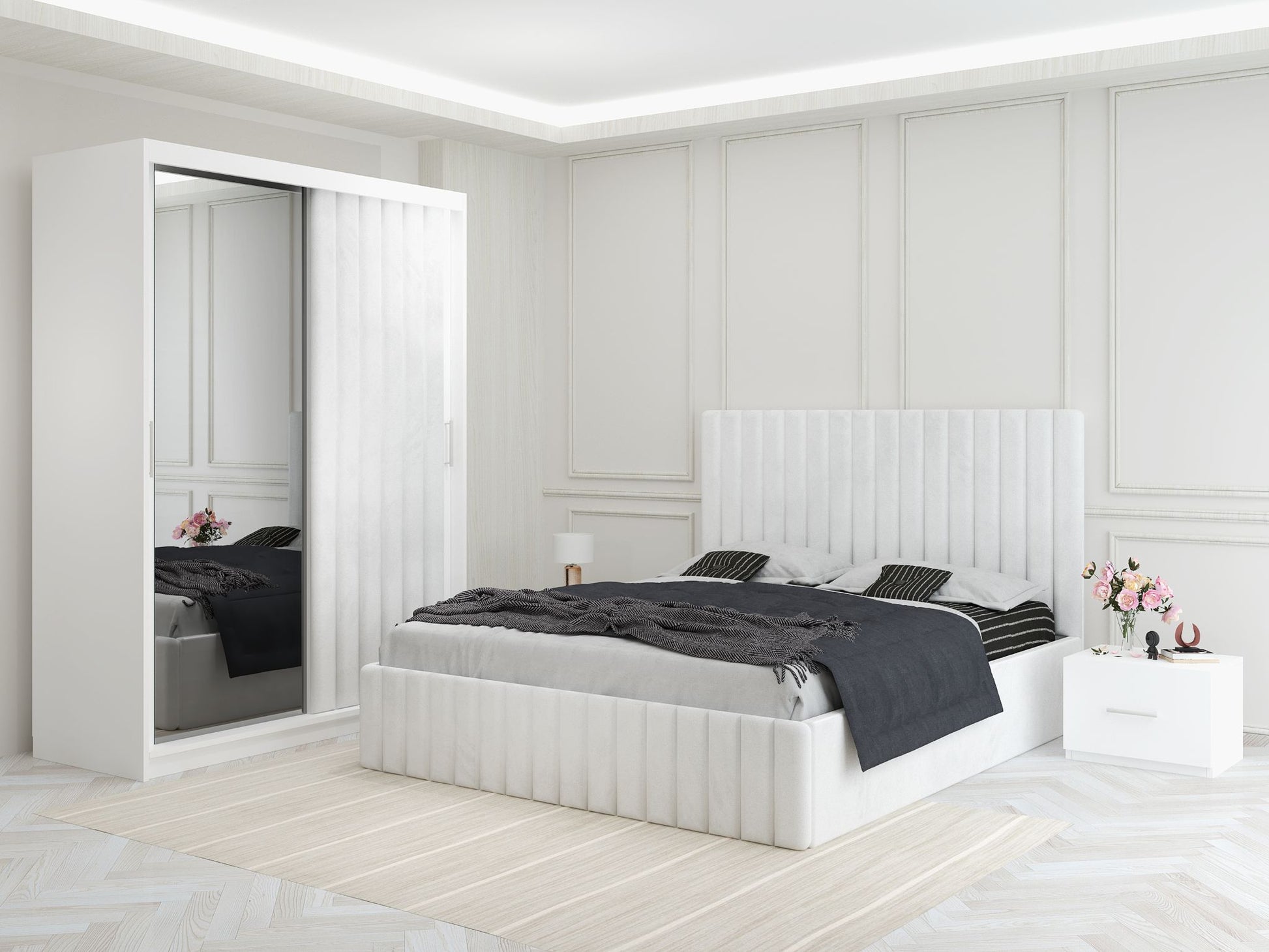 Dormitor Melania Alb cu Dressing Tapitat