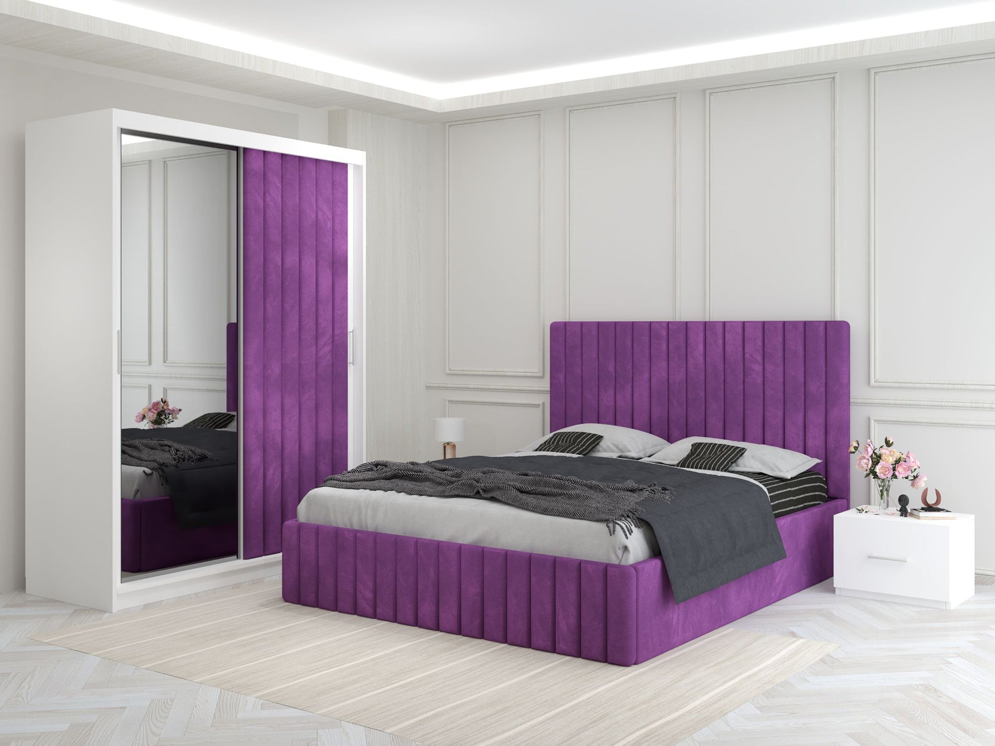 Dressing modern (150 x 200 cm) cu două uși – una cu oglindă de dimensiuni mari, ce mărește vizual spațiul, și una tapițată, perfect asortată cu patul.