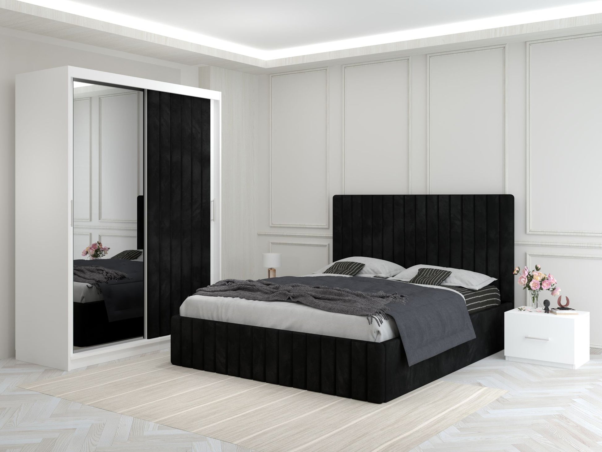 Dressing modern (150 x 200 cm) cu două uși – una cu oglindă de dimensiuni mari, ce mărește vizual spațiul, și una tapițată, perfect asortată cu patul.