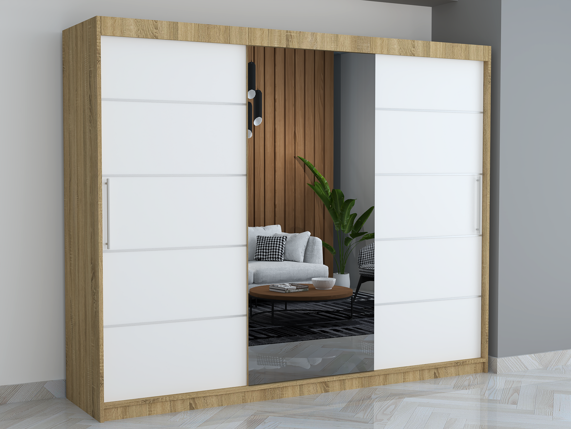 Design cu 3 uși glisante, una dintre ele prevăzută cu oglindă mare centrală – perfectă pentru a crea senzația de spațiu și lumină în cameră