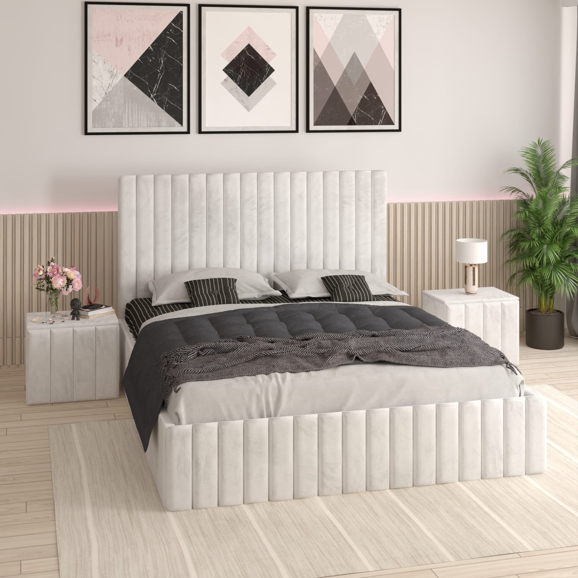 Pat Melania Alb Catifea Premium cu Noptiere Tapitate