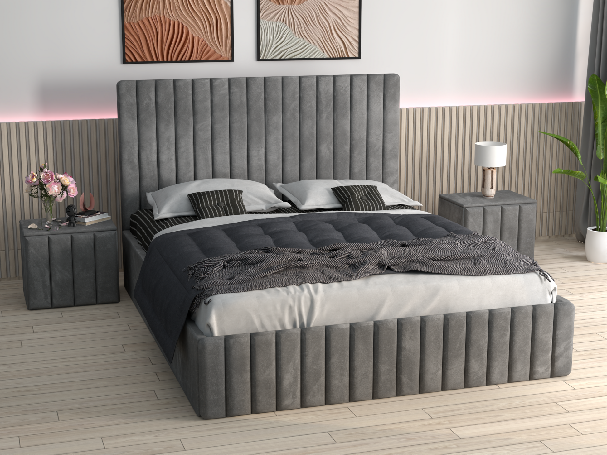 🔸 Noptiere tapițate asortate – completează armonios ansamblul, oferind un spațiu practic de depozitare și un design unitar, în aceeași linie estetică cu patul.