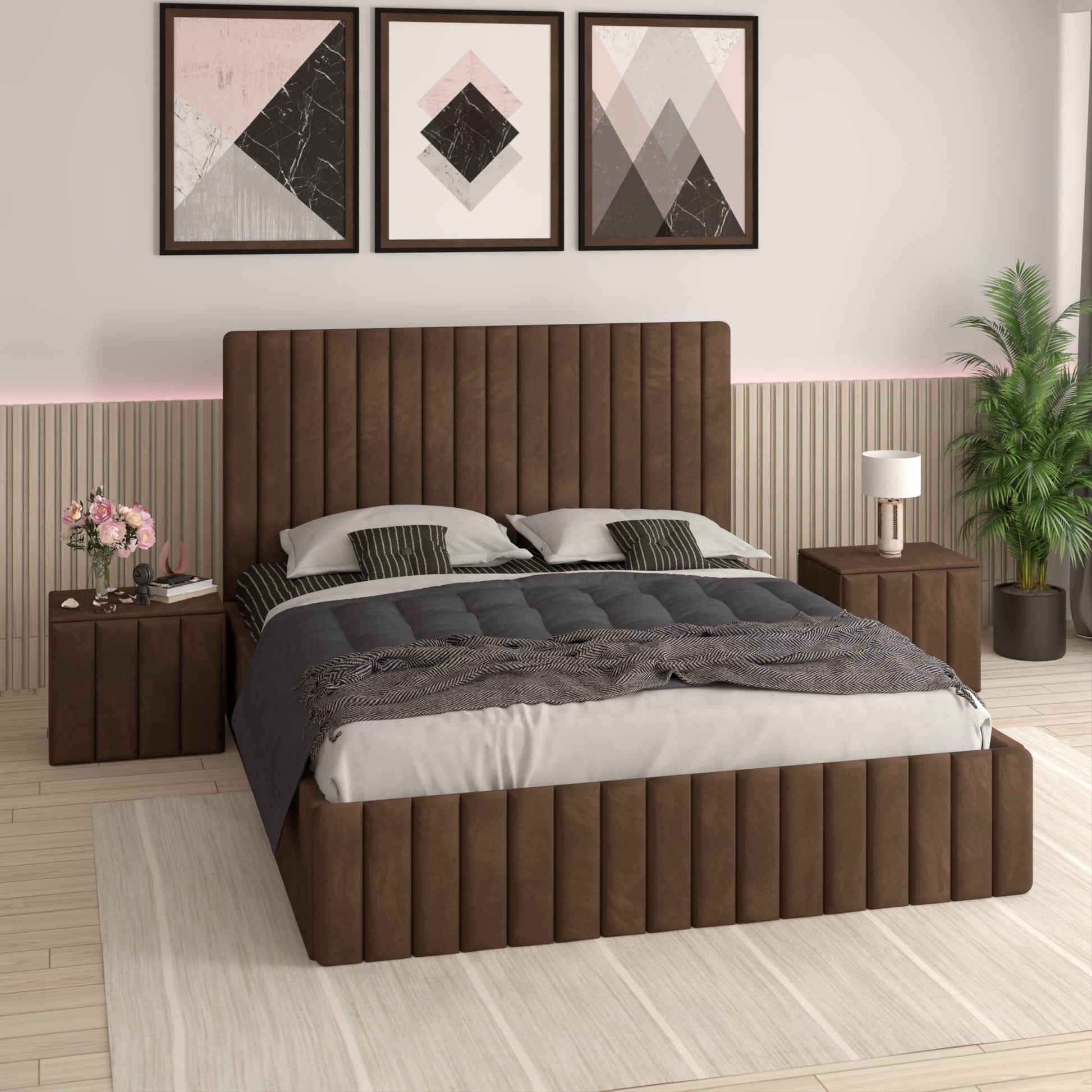 🔸 Noptiere tapițate asortate – completează armonios ansamblul, oferind un spațiu practic de depozitare și un design unitar, în aceeași linie estetică cu patul.