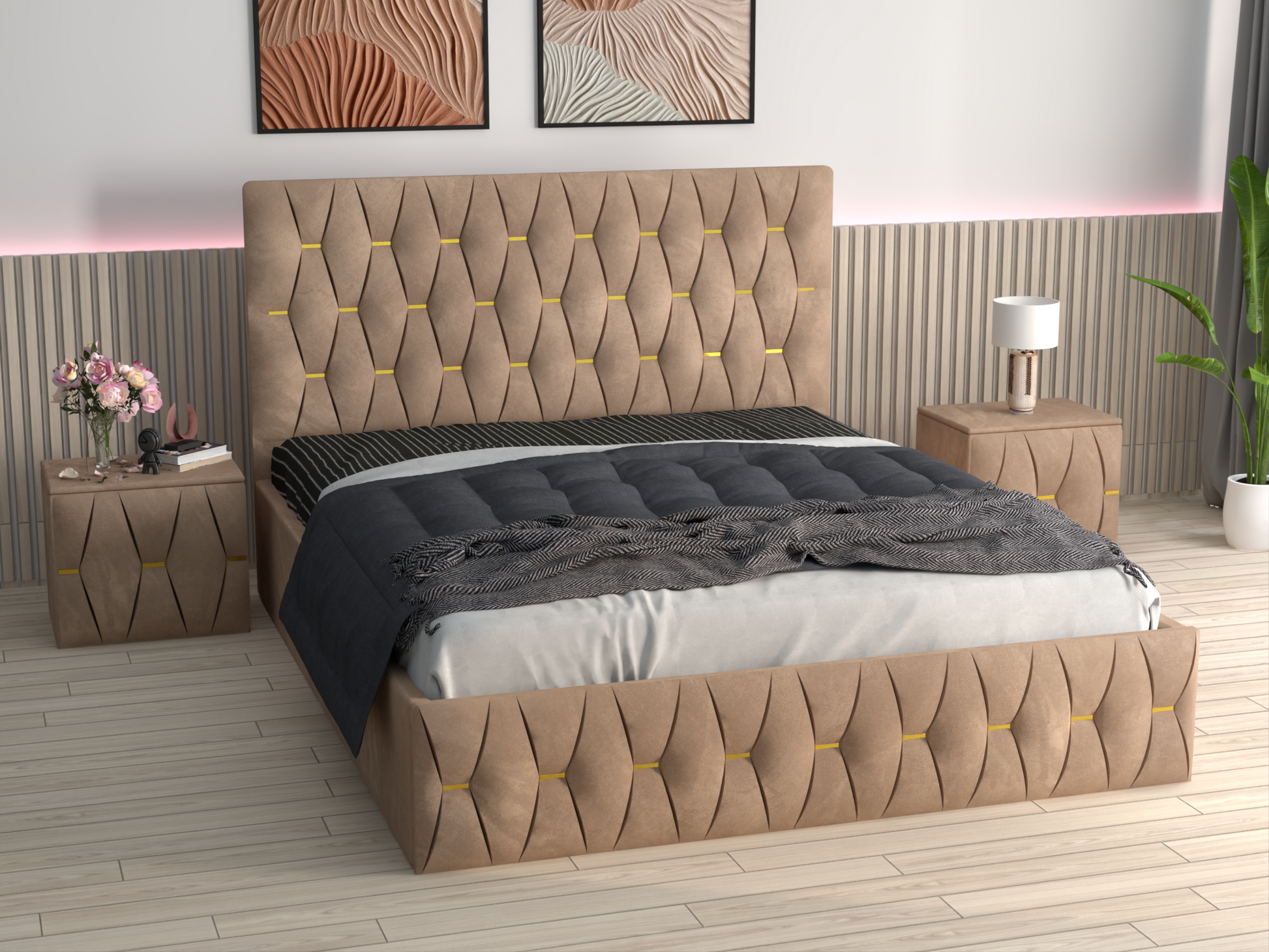 Transformă-ți dormitorul într-un spațiu sofisticat și confortabil cu patul tapițat Ana, o piesă de mobilier ce îmbină eleganța modernă cu funcționalitatea inteligentă. Designul său unic este evidențiat de tapițeria fină și detaliile geometrice lucrate cu grijă, completate discret de inserțiile aurii, care adaugă un plus de stil și rafinament.