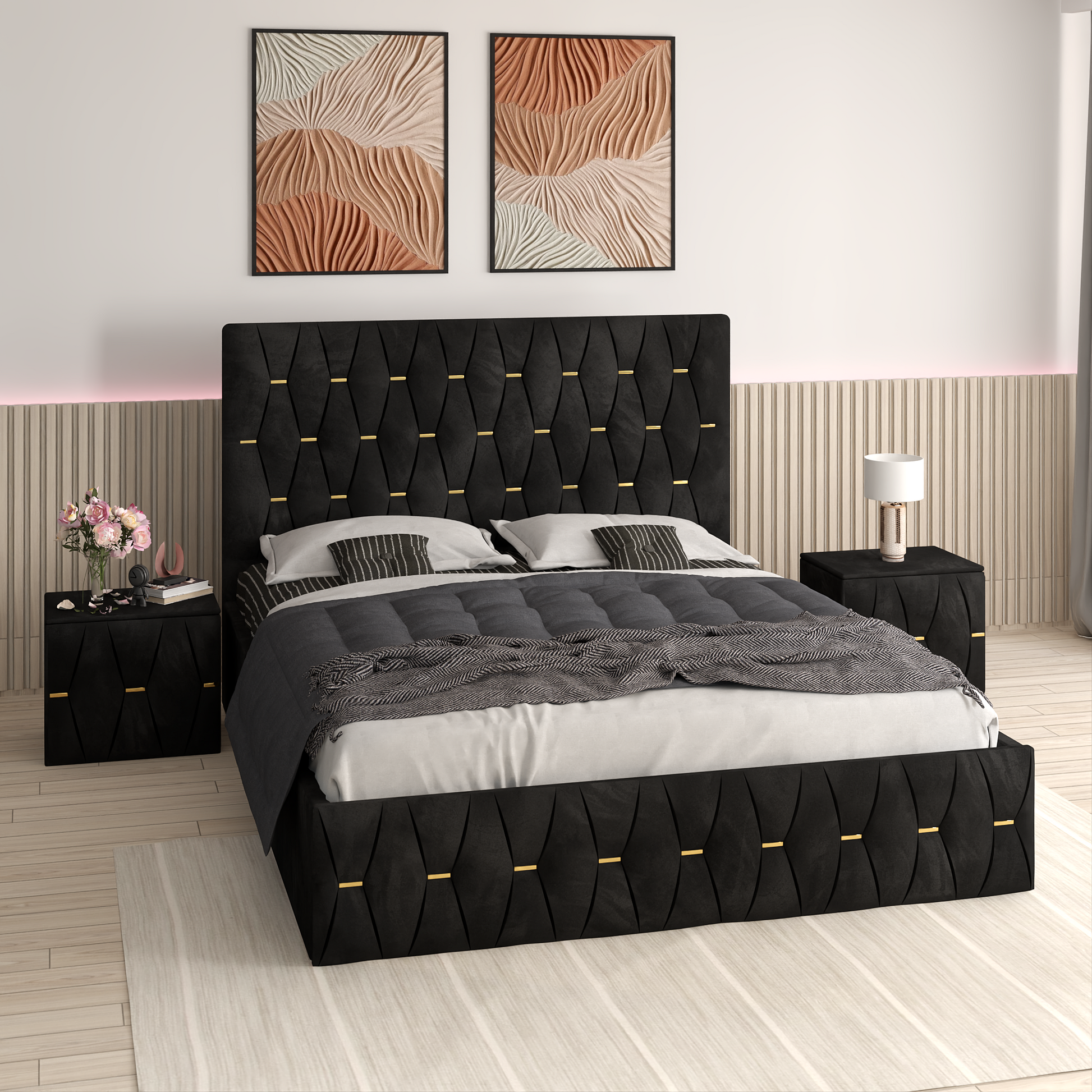 Pat Tapitat Ana Negru Catifea Premium cu Noptiere Tapitate