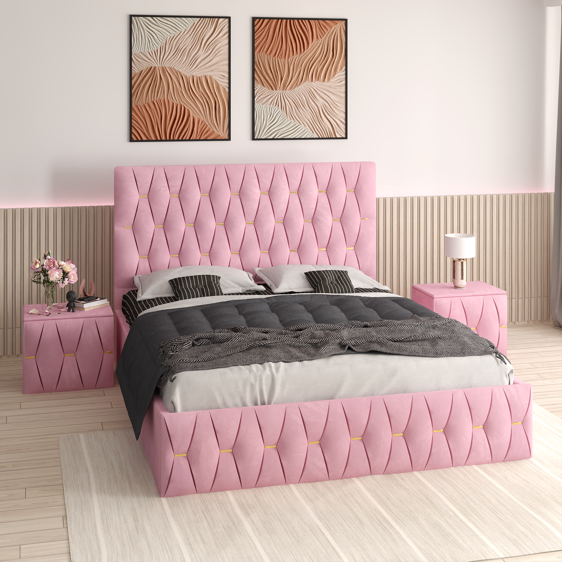 Pat Tapitat Ana Roz catifea Premium cu Noptiere Tapiate