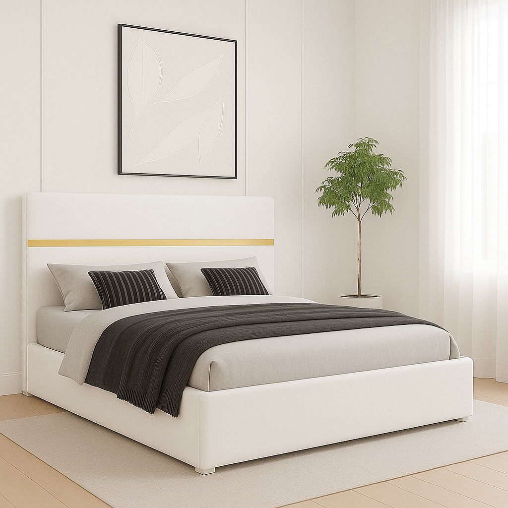 Transformă-ți dormitorul într-un spațiu de relaxare sofisticat cu patul tapițat Sofia, realizat din materiale premium și finisat cu o bandă aurie decorativă pe tăblie. Designul minimalist este pus în valoare de detaliile luxoase, oferind un echilibru între confort, funcționalitate și estetică.