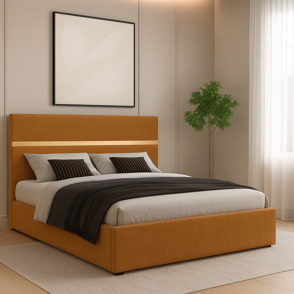 Transformă-ți dormitorul într-un spațiu de relaxare sofisticat cu patul tapițat Sofia, realizat din materiale premium și finisat cu o bandă aurie decorativă pe tăblie. Designul minimalist este pus în valoare de detaliile luxoase, oferind un echilibru între confort, funcționalitate și estetică.